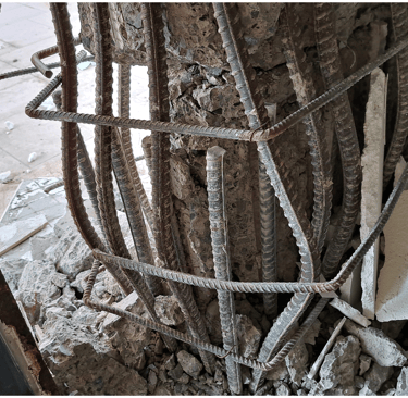 Figures 2 (a) and (b), for example, show the front and back walls of a 12-storey shear-wall building located on the coastline of Iskenderun. Although it is not a straightforward task to determine if the amount of reinforcement was sufficient or if the design resistance of the concrete was reached, it is evident that some omissions were made during the construction process. For example, the angle of the hooks in the steel ties was observed to be 90°, rather than the 135° required by most modern regulations, which may have limited the confinement effect of the reinforcement and reduced the capacity of the shear wall. Moreover, rather than having the vertical longitudinal bars overlapping at alternating heights along the wall, the overlap is concentrated at the bottom portion of the wall, leading to a sudden change of the steel reinforcement on the portion of the wall which is likely experiencing the largest earthquake demands. These deficiencies were not only observed in this building, but in several damaged structures throughout the region, as well as buildings under construction.