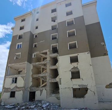 Another example of construction (and perhaps design) deficiencies is shown in Figure 2 (c). This image captures the boundary between two 11-storey shear-wall buildings located in Malatya. They are part of a social-housing development composed of over a hundred of these buildings, all of which are clustered in two or three adjacent building sets and exhibited similar damage patterns. As observed, the separation between the structures is practically non-existent, except for a 5-centimeter polystyrene layer. In addition, this layer was observed to have moved during the pouring of the concrete, while the concrete was not adequately vibrated, and air bubbles were often observed. All the buildings assessed in this development exhibited the damage pattern observed in Figure 2 (d), in which the shear walls of the basement and ground floors failed by shear in the East-West direction.