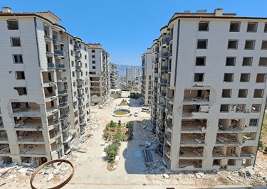 Entire neighbourhoods, some of them with hundreds of mid-to-high-rise buildings, were evacuated and their residents were displaced to temporarily government shelters, relatives’ homes and emergency tents placed right next to the evacuated sites. Figure 3 (c) shows an example of these neighbourhoods in Antakya, in which thousands of families were permanently displaced as a consequence of heavy non-structural damage (and possibly structural damage). As a consequence of this, the Turkish government has undergone a large and unprecedented rebuilding campaign throughout the region to provide the urgently needed housing, mostly based on tunnel-form buildings (see Figure 3 (d)), which standardised construction processes allow for the quick erection of the structures. Thus, the challenge for the country is not to provide a fast solution for accommodation of the displaced communities, but to make sure that the highest design and construction standards are followed to the letter. To build back better.
