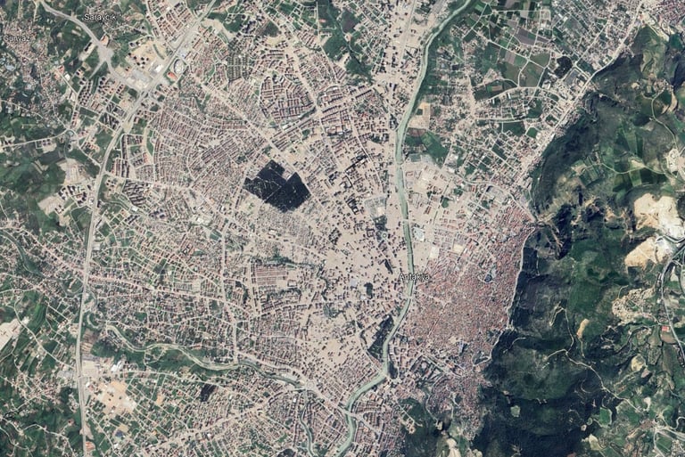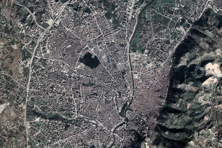 Figure 1. Before and after satellite view of the city of Antakya. Picture (a) was taken before the earthquakes in February 2023, while picture (b) was taken on April 2023. (Credits to Maxar Technologies, Airbus and Google Earth)